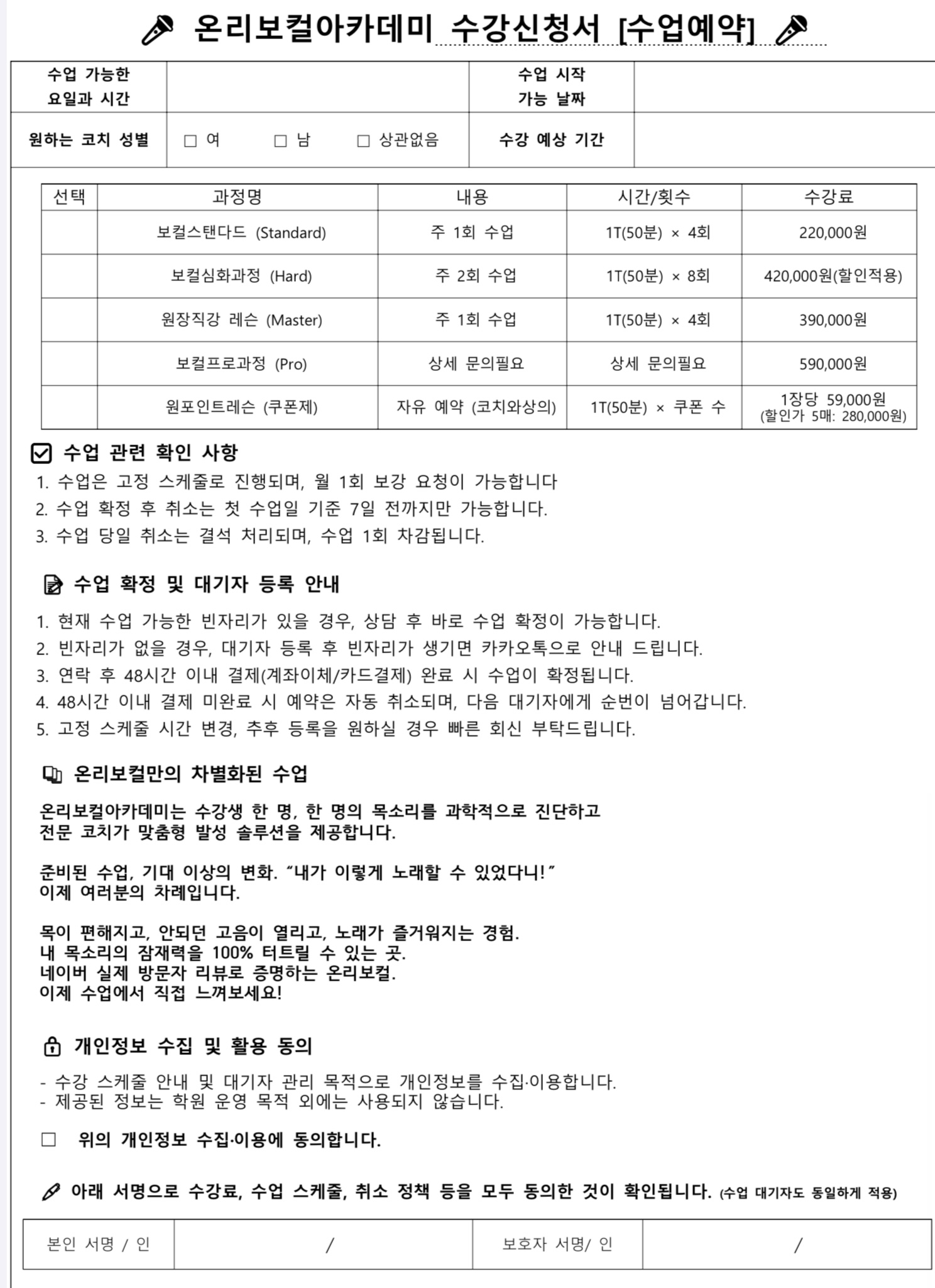 레슨 전 필수로 내원 방문 상담이 필요합니다. 방문 상담은 100% 예약제로 진행 중이며: